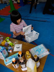 お遣いの『ゴミ袋』や『サラダ油』、『白だし』など、商品を手に取って確認していました。