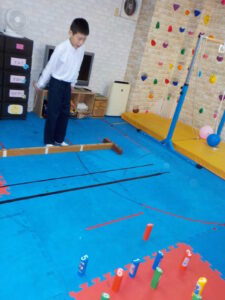 モルック(木の棒)を投げて、数字が書かれたピンを倒して