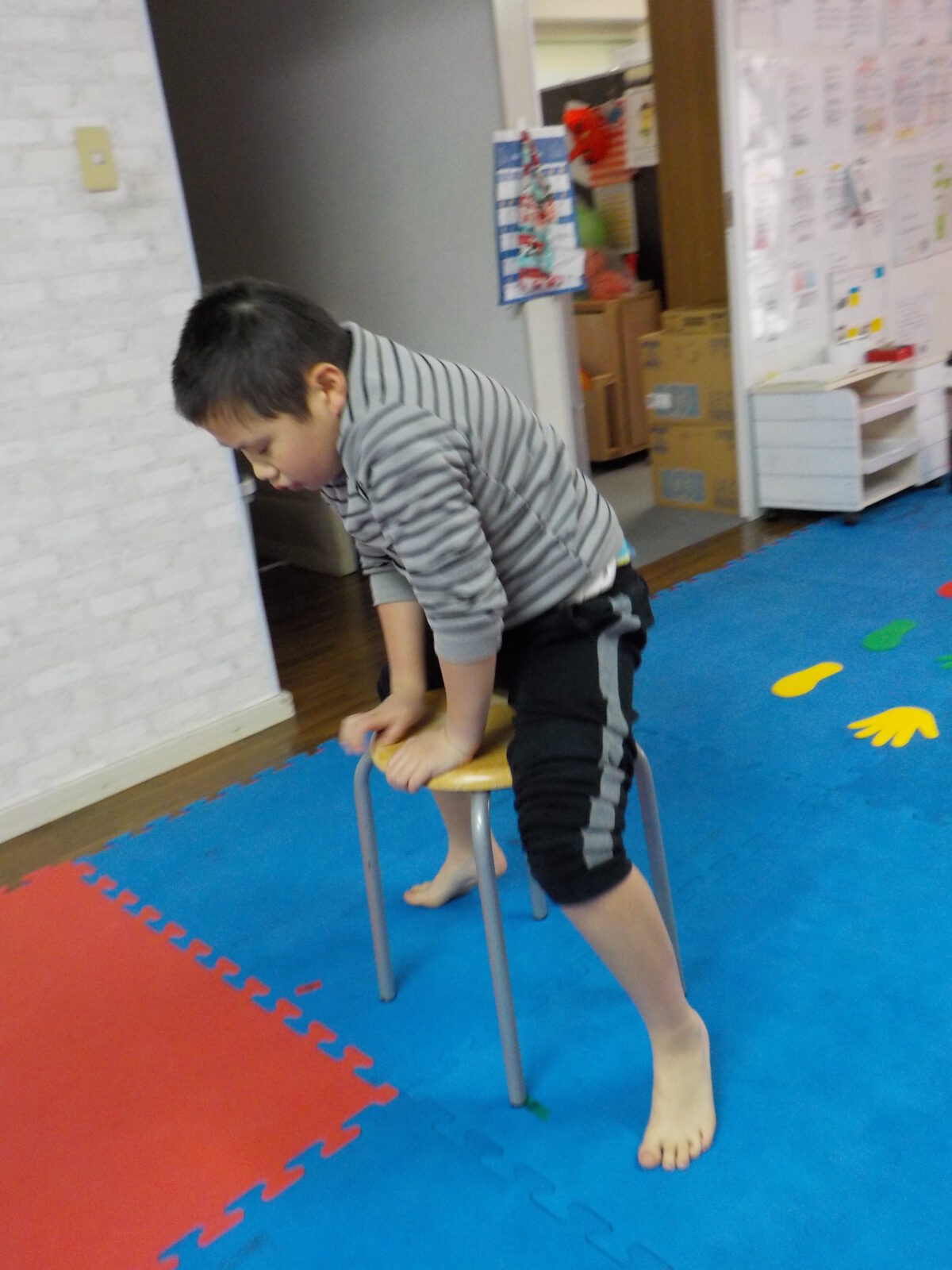 ウシガエル跳び🐸や応用して丸椅子を両手両足を合わせて飛ぶ練習をしました。🏃➡️